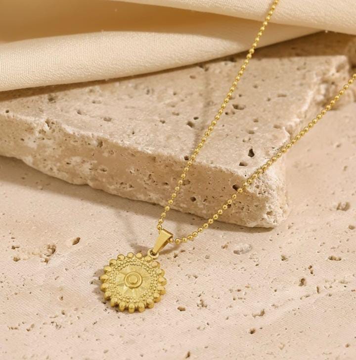Channel the warmth and energy of the sun with the Sunburst Medallion Pendant Necklace. This striking accessory features a highly detailed, circular sunburst medallion that serves as a radiant centerpiece. The pendant is embossed with a central solar motif surrounded by intricate, beaded rays, giving it a rich, textured appearance reminiscent of ancient artisanal treasures.