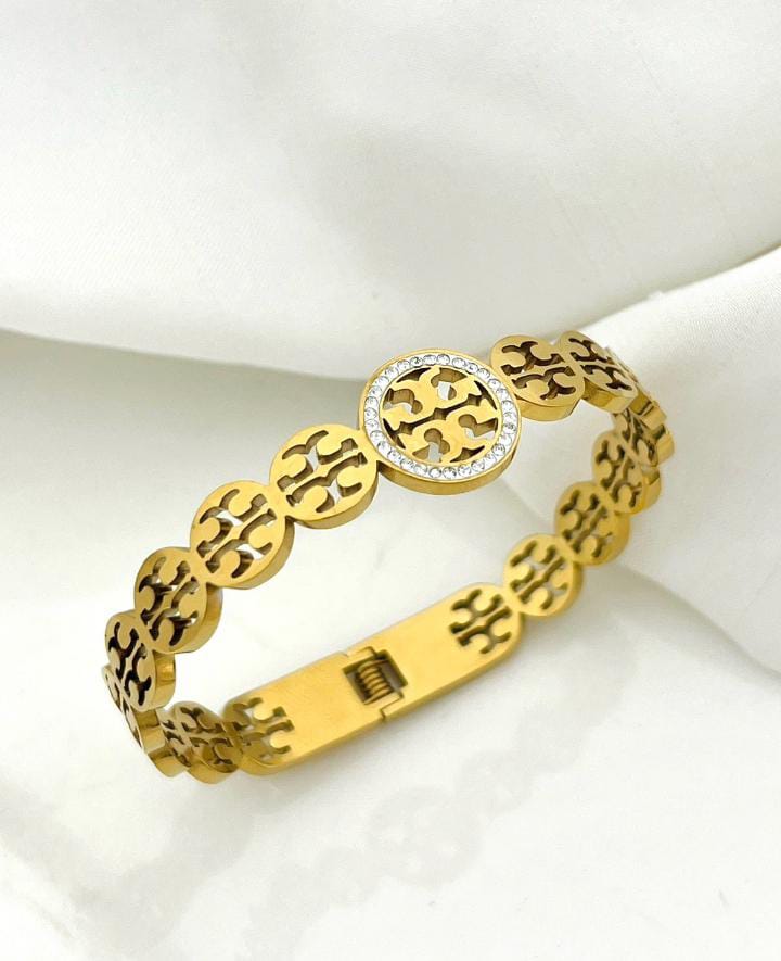 Experience a fusion of high-fashion branding and timeless luxury with the Imperial Medallion Bangle. This striking cuff-style bracelet is meticulously crafted from premium gold-finish stainless steel, featuring a bold, repetitive cutout motif that exudes architectural elegance.