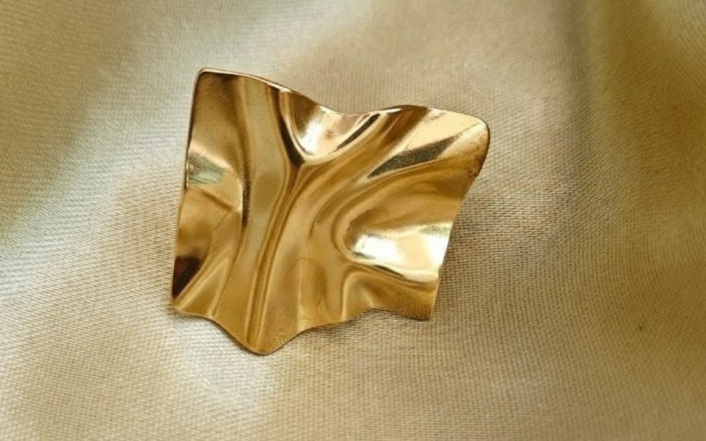 Capturing the effortless grace of fabric in motion, this Draped Silk Abstract Shield Ring is a wearable work of art. The sculptural surface is designed to mimic the fluid ripples of pleated silk, creating a dynamic interplay of light and shadow. With its oversized, organic silhouette, this ring serves as a bold statement piece for the modern minimalist.