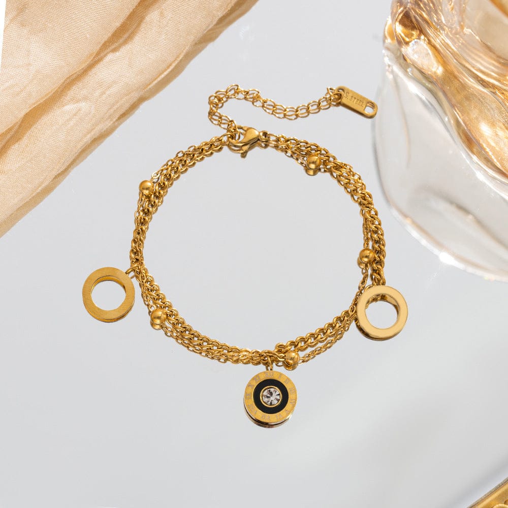 The Eternal Roman Medallion Multi-Chain Bracelet is a sophisticated fusion of classical inspiration and contemporary layering. This statement piece features a textured combination of multiple gold-tone chains adorned with sleek circular charms and a stunning central medallion. It is designed for the modern woman who loves jewelry that tells a story of timeless elegance.