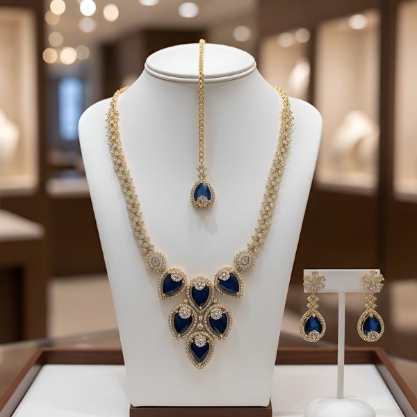 An opulent gold-toned jewelry ensemble featuring a tiered teardrop necklace, matching floral-accented drop earrings, and a traditional maang teeka, all centered with deep blue gemstones and brilliant crystal halos.